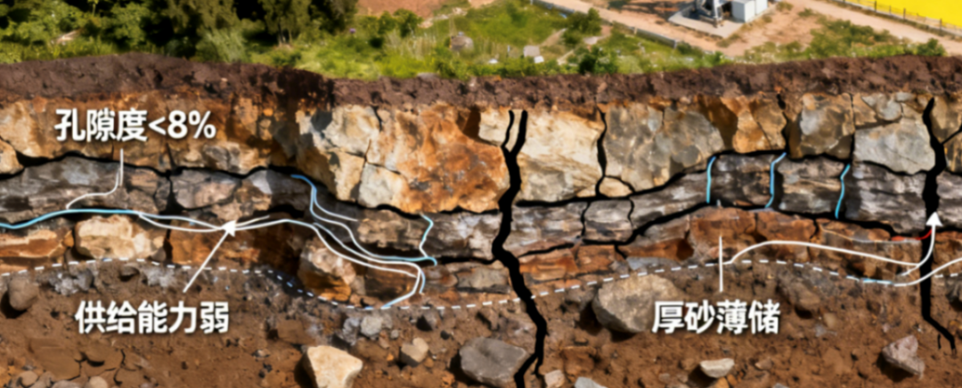 在技術(shù)攻關(guān)前,特低滲區(qū)塊致密氣井平均產(chǎn)量較金秋、簡陽等主力區(qū)塊低近20%。其根本原因在于,特低滲儲層物性條件極差(滲透率<0.2mD,孔隙度<8%),加之“厚砂薄儲”及基質(zhì)供給能力弱的地質(zhì)特征,共同導(dǎo)致單一水力裂縫動用程度低,且常規(guī)多縫壓裂工藝在此收效甚微。